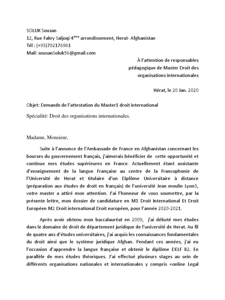 Une lettre de motivation/intentions (une page) . Elle permet aussi, selon le profil des étudiants, d'envisager une carrière à l'international (organisations internationales, ong). Une recommandation d'un professeur de droit international. Exemple gratuit d'un modèle de courrier de candidature pour faire une demande d'admission en master droit international et européen au sein . Le cas échéant, une liste de publications;